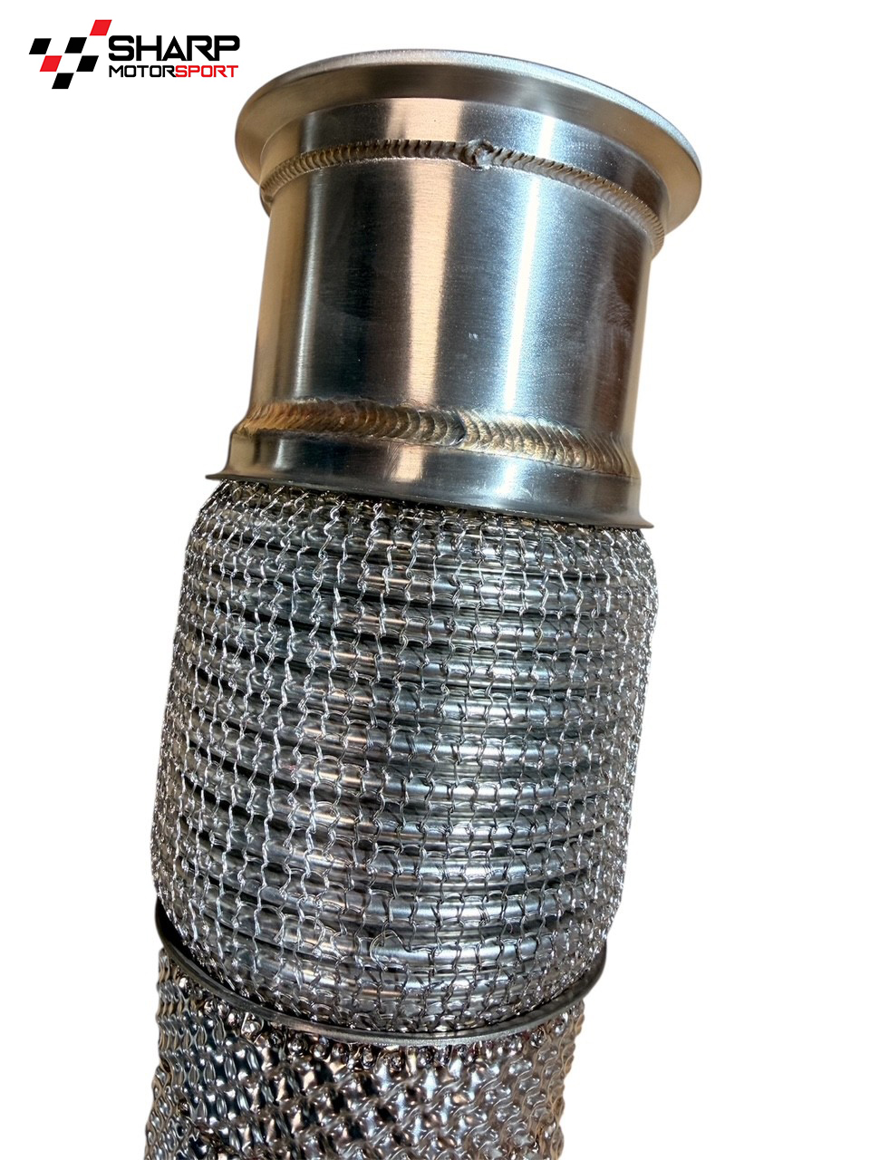The Downpipe uses the OEM Vband connection to the turbocharger transitioning to 85mm tube(internal dia)that bends smoothly with a corrugated reinforced stainless steel flex joint and a Vband flange at the end to the Mid-pipe.